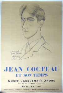174.[AFFICHES - EXPOSITIONS]. PICASSO. Réunion de deux affiches) :•Jean Cocteau et son Temps. Musée Jacquemart-André. Mars - mai 1965. Imp. Mourlot. Cachet Debauve au verso.Affiche lithographiée, 71 x 48 cm, représentant un portrait de Cocteau...