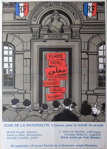 177.[AFFICHES - JUSTICE & SOCIÉTÉ]. Réunion d’une cinquantaine d’affiches du Syndicat de la Magistrature, Amnesty, etc. (Cachet Debauve au verso de la plupart des affiches dont : •TARDI (Jacques). Code de la Nationalité. 30 septembre...