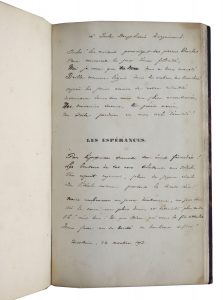 190.[ALEXANDRE (Charles)]. Les Espérances. Pagnerre, 1852.In-8, reliure demi-veau violet foncé à coins, dos à 4 nerfs orné de filets à froid, tête dorée. 246 pp. Bon exemplaire.Édition originale, avec un long poème manuscrit adressé à...