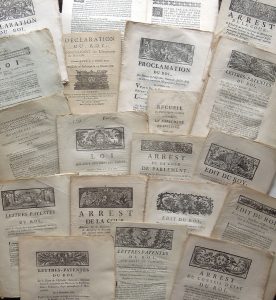 194.BRETAGNE. IMPRIMÉS XVIIIe siècle. Réunion d’une cinquantaine d’imprimés : Arrêts, décrets, lettres patentes… dont : •Déclaration du Roi concernant les Usurpateurs de Noblesse. 1717.•Arrest de la Cour … portant Reglement pour...