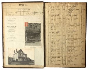 comportant la liste des envois de paniers d’huîtres avec noms des destinataires et récapitulatif mensuel.Joint un papier à lettres indiquant : Spécialité d’huîtres fines Les Parcs de Pentes Ancienne maison Juteau père et fils, Martine Successeur et deux cartes postales de deux écaillers dont Maison Dufour à Rouen, 1912.