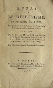 nerfs orné. Coiffe inférieure arasée, coupes inférieures frottées. T. 1 : (4)-xiv-(2)-366-(1) pp. T. 2 : 237 pp. Qq. rousseurs.Edition originale posthume.•Essai sur le Despotisme. Troisième édition, corrigée de la main de l’Auteur sur l’exemplaire de la seconde édition acheté à sa vente. Précédé De la Lettre de M. de S. M. aux Auteurs de la Gazette Littéraire, & suivi de l’Avis aux Hessois & de la Réponse aux Conseils de la Raison. Paris, Le Jay, 1792. In-8, broché. Couverture d’attente. xl-336 pp. Qq. rousseurs. L’édition originale de cet Essai est parue sans nom d’auteur en 1775.