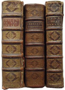 édition. Lyon, Plaignard, 1703. In-8, reliure de l’époque veau brun, dos à 5 nerfs orné, pièce de titre maroquin bordeaux. (2)-32-848-(16) pp. Bon état général.La première édition est parue en 1643. Brunet I, 489.•PIPET (J.). Instructions Chrétiennes sur plusieurs Points de Morale, tirées de l’Ecriture Sainte & des Peres Et particulièrement touchant le Luxe et la Vanité des Femmes. Paris, André Pralard, 1678. In-8, reliure veau brun, dos à 5 nerfs orné. Coiffe supérieure manquante, fente au départ du mors du premier plat en tête et pied. (26)-750-(1) pp. Petite galerie de vers et trace de mouillure en tête au début de l’ouvrage. Ex-libris : séminaire d’Auch. Edition originale.•HELFTA (Gertrude). GRANADA (Leandro de), traducteur. Libro Intitulado Insinuacion de la Divina piedad, revelado a Sancta Gertrudis, Monja de la orden de Sant Benito. Traduzido de Latin en Romance por el P. M. fray Leandro de Granada… Salamanque, Diego Cussio, 1603. In-8, reliure postérieure veau brun, dos à 5 nerfs orné. Mors du premier plat fendu, coins et coupes usés. (16)-86-(36)-610-284 pp. Plusieurs galeries de vers en marge, pouvant toucher qq. lettres, annotations en partie caviardées en page de titre. Vignette de titre gravée. Ex-libris : Séminaire d’Auch.Edition originale de cette traduction en espagnol augmentée d’une vie de Sainte Gertrude.