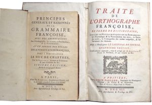 Versification Françoise… 6e édition, Revûë & corrigée par l’Auteur. Paris, Lottin, 1750. In-12, reliure basane marbrée, dos à nerfs orné. Épidermures, dos et tranchefiles recollés. xxxiv-(2)-512 pp. La première édition a été publiée en 1730.•[LE ROY (Charles)]. Traité de l’Orthographe Françoise, enrichi de Notes critiques et de remarques sur l’Étymologie & la Prononciation des mots, le Genre des noms, la Conjugaison des verbes irréguliers… 4e édition, Considérablement augmentée, revue & corrigée par M. Restaut. Poitiers, J. Felix Faulcon, 1752. In-8, reliure veau marbré, dos à nerfs orné. Petites déchirures aux coiffes, pièce de titre en partie manquante, coins usés. (14)-lxx-694-(2) pp. Petite tache claire en marge des trois premiers ff. Bandeaux, lettrines et culs-de-lampe sur bois gravés.
