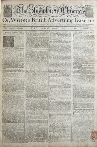 plat détaché. Bon état intérieur. L’hebdomadaire de Shrewsbury (comté de Shropshire), fondé et dirigé par Thomas Wood, est l’un des plus anciens du Royaume-Uni. Le premier numéro parut le 28 nov. 1772.