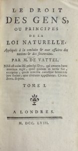 253.VATTEL (Emerich de). Le Droit des Gens, ou Principes de la Loi naturelle, appliqués à la conduite & aux affaires des nations & des souverains. Londres, s. n., 1758. 3 volumes in-12, reliure de l’époque veau brun marbré, dos à 5 nerfs...