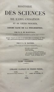256.BLAINVILLE (H. de), MAUPIED (F. L. M.). Histoire des Sciences de l’Organisation et de leurs Progrès, comme Base de la Philosophie; rédigée d’après ses notes et ses leçons… par Maupied. Paris, Lyon, Périsse frères, 1845. 3 volumes...