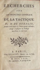 283.KERALIO (Louis Félix Guinement Chevalier de). Recherches sur les Principes Généraux de la Tactique. Paris, Desaint, 1769. In-12, reliure basane marbrée, dos à 5 nerfs orné. Légères épidermures, deux petits trous de vers au dos....