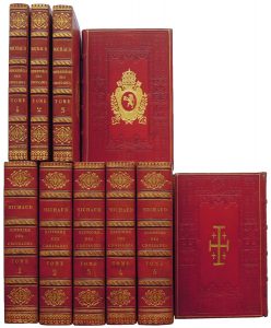 288.MICHAUD (Joseph-François). Réunion d’ouvrages :•Histoire des Croisades. 4e édition revue, corrigée et augmentée. Paris, Michaud jeune, 1825-1828. 6 volumes in-8, reliure (signée Simier Relieur du Roi au dos du t. 1) veau rouge, dos à 4...