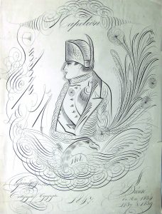 291.[NAPOLÉON - CALLIGRAPHIE]. LÉPINE de St OMER. Portrait de Napoléon 1808. 1847.Dessin au trait de plume sur feuille 64 x 48,5 cm. Plusieurs petites déchirures marginales (entre 1 et 3 cm) et 3 petits trous au verso de la feuille Portrait...
