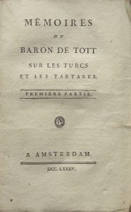 297.TOTT (François de). Mémoires du Baron de Tott sur les Turcs et les Tartares. Amsterdam, s. n., 1785. 3 volumes in-8, brochés. Couvertures d’attente (défraîchies, petites déchirures au dos). T. 1 : xl-187 pp. T. 2 : (4)-286 pp. T. 3 : 248...