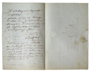 tenir le 26-27 courant, le manuscrit des contes drolatiques, attendu que je n’en ai plus que deux à faire mais, j’ai négligé pour ce ma mère nourrice, la Revue de Paris. Or, ayant à la fin du mois 389 fr. à faire payer, je désirerais savoir de votre hautesse typographique, si vous pourrez les remettre à ma mère, sur son reçu dont nous ferions compte. Si cela était impossible, je vous prie de m’en écrire aussitôt (château de Saché par Azai-le-Rideau Indre-et-Loire) parce que je descendrois de dessus l’hippogriffe Rabelaisien et m’occuperois à faire flèche d’autre bois, c’est à dire à parachever quelque chose qui se résolût par de l’argent comptant. Faites agréer mes hommages à madame Gosselin […] ».Il demande, en post-scriptum s’il a des nouvelles de Chasles et si les autres journaux ont parlé des romans et contes. [Les Cent Contes drolatiques parurent chez Gosselin et Werdet, de 1832 à 1837].