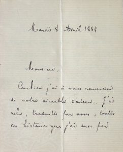 Baudelaire, qu’Emile Hennequin lui offrit. « Combien j’ai à vous remercier de votre aimable cadeau. J’ai relu, traduites par vous, toutes ces histoires que j’ai sues par cœur, avec un charme inconnu, beaucoup d’entre elles ne m’étant jamais apparues en Français Votre version est excellente, et donne exactement l’impression du style de Poe. Enfin, grâce à votre étude biographique, le cher et prodigieux poëte se montre donc, pour la première fois, au public parisien, tel qu’il fut. Il y a, par instants, de très justes et de profondes conclusions, que vous tirez, sans l’aide de notre ami Ingram, des documents amassés par ce dernier ; elles sont bien à vous. À peine un point ou deux sur lesquels nous discuterons, quand j’aurai le plaisir de vous voir : partant, pour cette semaine et la suivante, à la campagne. Merci encore, et quand paraîtra ma traduction des Poëmes, si elle paraît je compléterai de mon côté l’échange : pour l’instant recevez toute ma sympathie ».Publiée dans la Correspondance établie par Bertrand Marchal (N.R.F. 2019, n°587, pp. 518-519).