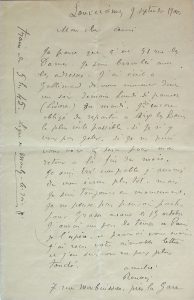 lundi si vous pouvez (lièvre) ou mardi. Je suis encore obligé de repartir à Aix les Bains le plus vote possible - si je n’y veux pas geler – si je ne puis vous voir ce sera pour mon retour à la fin du mois. Je suis très coupable, j’aurais dû vous écrire plus tôt. Mais je suis toujours en mouvement. Je ne pense pas pouvoir partir pour Grasse avant le 15 octobre. J’aurai un peu de temps à Paris je l’espère et pourrai vous avoir. J’ai reçu votre aimable lettre et j’en suis on ne peut plus touché ».
