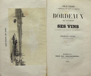 444.COCKS (Charles). Guide de l’Étranger à Bordeaux et dans la Gironde. Bordeaux ses Environs et ses Vins classés par ordre de mérite. Bordeaux, Féret fils, 1850. In-12, broché. Manque en tête et pied, tache en marge interne du premier plat,...