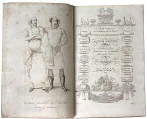 ou Traité élémentaire et pratique de la patisserie ancienne et moderne, suivi d’observations utiles aux progrès de cet art, et d’une revue critique des grands bals de 1810 et 1811… 3e édition revue, corrigée et augmentée. Ouvrage orné de 41 planches dessinées par l’Auteur comprenant 182 sujets gravées au trait par Normand fils, Hibon et Thierry. Paris, Renouard, Tresse,Royer, Mansut, Maison, Dauvin et Fontaine, 1841. T. 1 : Titre-frontispice, xcii-399 pp. et 13 planches hors texte. Feuillets détachés, traces de mouillure et déchirure. Ouvrage manipulé. T. 2 : (4)-443 pp. et planches numérotées 14 à 41 hors texte.La première édition est parue en 1815. Vicaire 144.• Le Cuisinier Parisien ou L’Art de la Cuisine Française au XIXe siècle… Traité élémentaire et pratique des entrées froides, des socles, et de l’entremets de sucre… 2e édition, revue, corrigée et augmentée, orné de 25 planches dessinées par l’Auteur, et gravées au trait par Normand fils, Hibon et Thierry. Paris, Renouard, Tresse, Mansut, Maison, 1842. Titre-frontispice, 422 pp. et 24 planches dépliantes. Rousseurs.• Le Maître-d’Hôtel Français, Traité des Menus à servir à Paris, à St-Pétersbourg, à Londres et à Vienne. Nouvelle édition revue, corrigée et augmentée. Tome 1. Paris, Renouard, Mansut, Tresse, Maison, Dauvin et Fontaine, Dentu, 1842. Frontispice, titre-frontispice (daté 1822), xi-352 pp., 3 pl. hors texte et 12 tableaux dépliants (exemples de menus). Rousseurs. Tome 1 seul.La première édition est parue en 1822. Vicaire 145.