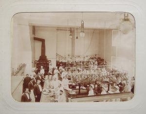 à droite, tranches dorées. Mors du premier plat fendu, plats épidermés.Superbe et rare album de 33 tirages albuminés insérés dans l’album (format à la vue : 16,5 x 23 cm), portant un cachet à sec ovale dans l’angle supérieur droit : J. David. Rousseurs sur les passe-partout, tirages contrastés en bel état.L’ensemble des photographies est réparti en vues extérieures et terrasses (9), vues intérieures, salle à manger, salons de réception, grand escalier (13), vues des cuisines (2), personnel (2), ferme et étable (4), parc (3).Jules David (1848-1923), installé à Levallois à partir de 1875, était spécialisé dans les portraits de groupes scolaires et militaires et associés quelques temps avec Claude Bretagne à l’enseigne Photographie des Ecoles. Photographe attitré de plusieurs grands lycées parisiens, il s’associe vers 1910 avec Edmond Vallois et s’installe au 99 rue de Rennes.On joint une photographie (26,5 x 36,5 cm) d’un banquet avec cachet à sec J. Jacks & Co 22-24 Glasshouse St. Regent St. London