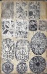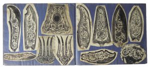 473.[ORFÈVRERIE]. Modèles et Relevés de Pièces d’Orfévrerie. Fin XIXe - début XIXe s.Réunion de deux cahiers en état d’usage et planches comportant plus de 840 motifs découpés (gravures ou estampages) reproduisant des manches de...
