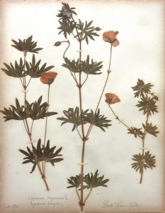 insérée dans un double feuillet. Rousseurs ou papier souvent bruni.Un recueil de 55 planches intitulé Renonculacées contenant : Renoncules, clématite, aconits, pigamon (thalictrum), héllébore, actée, ancolie, delphinum, isopyre… Un recueil de 52 planches comportant plusieurs espèces : Hypéricinées, Euphorbiacées, Linées, Géraniacées, Rutacées, Polygalées, Célastrinées, Cistinées, Rhamnées, Acérinées, Papavéracées, Ciolariées, Tamariscinées, Fumarariacées, Berberidées… Soit 107 planches au total.Herbier à la présentation soignée montrant souvent plusieurs spécimens par planche, accompagné de notes manuscrites comprenant nom latin, lieu et date de récolte. Un nom apparaît sur certaines planches : E. Perrier, peut-être l’auteur de cet herbier minutieusement élaboré.