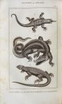 1836. 3 volumes in-8, reliure demi-basane verte, dos lisse orné de fers romantique. Qq. frottements, un mors fendillé sur 3 cm, une coiffe arasée. T. 1 : Frontispice (portrait de Lacépède), (4)-488 pp. et 60 planches hors texte (tortues, sauriens, batraciens, serpents, poissons). T. 2 : Frontispice (portrait de Cuvier), (4)-480 pp. et 48 planches hors texte (suite des poissons, pl. numérotées 17 à 64). T. 3 : Frontispice (portrait de Buffon), (4)-427 pp. et 56 planches hors texte (suite des poissons, pl. numérotées 65 à 115, 5 pl. de cétacés). Rousseurs plus ou moins prononcées. Soit un total de 164 planches gravées sur acier (environ 500 animaux).