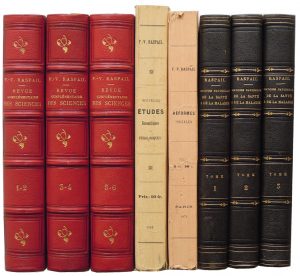 volumes in-8, reliure demi-chagrin rouge, dos à 4 nerfs orné. Minime galerie de ver sur le mors d’un volume. T. 1-2 (1855-1856) : (4)-392-384 pp. T. 3-4 (1856-1858) : (4)-384-(4)-384 pp. T. 5-6 (1858-1860) : (4)-384-(4)-384 pp. Rares rousseurs. Très bon état général.•Nouvelles Études Scientifiques et Philologiques. 1861-1864. Avec 10 planches sur cuivre et 4 lithographies, dessinées et gravées par son fils Benjamin Raspail. Paris, chez l’éditeur des ouvrages de M. Raspail, 1864.Grand in-8, broché. xii-403 pp. et 14 pl. in fine. Rares rousseurs, trace de mouillure assez marquée sur la moitié inférieure des planches.Édition originale.•Histoire Naturelle de la Santé et de la Maladie chez les Végétaux et chez les Animaux en général, et en particulier chez l’homme… avec des figures sur bois dans le texte et 19 planches gravées sur acier, d’après les dessins originaux et les premières gravures de son fils. 3e édition considérablement augmentée. Paris, chez l’éditeur des ouvrages de M. Raspail, 1860.3 volumes in-8, reliure demi-chagrin brun, dos orné de filets dorés et à froid. T. 1 : Frontispice, vii-(1)-civ-344 pp. et 19 planches gravées in fine. T. 2 : viii-552 pp. T. 3 : viii-552 pp. Rares rousseurs. Bon état général.On joint : Réformes Sociales. Paris, Bureau des Publications de M. Raspail, 1872.Grand in-8, broché. (4)-4-453-(1) pp. Rares rousseurs, trace de mouillure claire sur qq. ff. en pied. Bon état général.