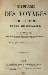524.DANCEL (J.-F.). De l’Influence des Voyages sur l’Homme et sur ses Maladies. Ouvrage spécialement destiné aux gens du monde. Paris, Baillière, Garnier, 1846. In-8, reliure percaline chagrinée marron, titre doré au dos. Coins usés....