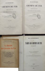 dos à 5 nerfs. Mors et nerfs frottés. T. 1 : (4)-iv-427 pp. T. 2 : (4)-384 pp. Petite déchirure en marge d’un f. Cachet de bibliothèque sur les pages de titre. Bon état général.•MARQFOY (Gustave). De l’Abaissement des Tarifs de Chemins de Fer en France. Paris, Librairie Nouvelle, 1863. In-8, reliure demi-chagrin vert, dos à 4 nerfs orné, filets à froid sur les plats. Qq. frottements sur les nerfs et coupes. (4)-iii-iii-203-(1)- 32-58-(2)-32 pp. et 3 planches dépliantes. Rousseurs en début et fin de volume. Ex-libris : Armand Gommès.•MILHAUD (Edgard). Le Rachat des Chemins de Fer. Paris, Cornély, 1904.In-12, broché. Dos cassé. xiii-315 pp. Non coupé.