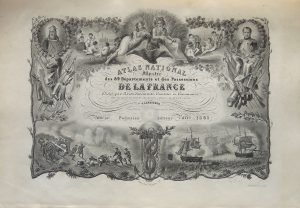 artitstes. Paris, Pelissier, 1861.In-plano, reliure remontée avec plats recouverts de toile noire, dos et titre orné d’origine conservés. Recueil comportant 96 cartes des départements et colonies numérotées 1 à 93 et 3 non numérotés (Alpes Maritimes, Savoie, Haute Savoie), une planisphère et 6 cartes des continents. Cartes en bel état.Atlas complet des 100 cartes décoratives aux encadrements historiés, avec les limites rehaussées en couleurs.