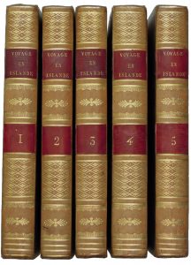 volcans, des diverses espèces de Terres, Pierres, Fossiles et Pétrifications; des Animaux, Poissons et Insectes, etc… Traduit du danois par Gauthier-de-Lapeyronie. Paris, Frères Levrault, 1802. 5 volumes in-8, reliure de l’époque basane flammée, dos lisse orné, pièces de titre et de tomaison maroquin rouge, roulette dorée en encadrement sur les plats. Qq. épidermures, trace brune sur un plat. (4)-iv-444-(4)-434-(4)-400-(4)-451-(4)-419 pp. Qq. rousseurs, petite trace brune dans l’angle des derniers ff. au t. 4. Sans l’atlas.Première édition française. Bon exemplaire sans l’atlas. Chadenat 1777 qui note : Ouvrage le plus intéressant sur cette île.