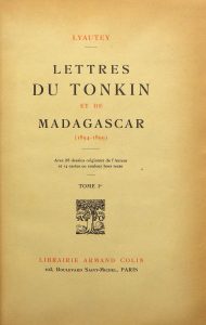 554.LYAUTEY (Maréchal Hubert). Lettres du Tonkin et de Madagascar (1894-1899). Avec 28 dessins originaux de l’Auteur et 14 cartes en couleurs hors texte. Paris, Armand Colin, 1920.2 volumes in-8, reliure demi-basane brique, dos à 3 nerfs orné....