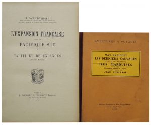 Transatlantique et n° d’inventaire en pied. 221-(2) pp. Qq. illustrations et cartes dans le texte.Joint : RADIGUET (Max). Les Derniers Sauvages. La vie et les mœurs aux îles Marquises (1842-1859). Paris, Duchartre, s. d. (1929). In-8, broché. Légère trace de mouillure en couverture. (4)-ix-(2)-240-(1) pp. et 16 planches hors texte. Qq. rousseurs. Non coupé.