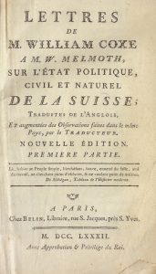 559.[SUISSE]. COXE (William). Lettres de M. William Coxe à M. W. Melmoth, sur l’état politique, civil et naturel de la Suisse; Traduites de l’anglois, et augmentées des Observations faites dans le même pays, par le Traducteur. Nouvelle...