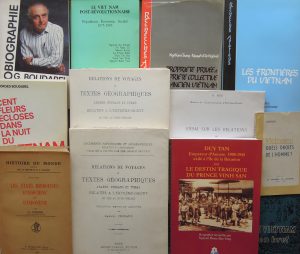 dépliantes. Qq. rousseurs. Edition originale.•BOUDAREL. Cent Fleurs écloses dans la nuit du Vietnam. Bertoin, 1991. Autobiographie. 1991. 2 vol. avec envoi. •LAFONT. Les Frontières du Vietnam. L’Harmattan, 1989. •Nguyen Phuoc Bao Vang. Duy Tan Empereur d’Annam 1900-19445 exilé à l’île de la Réunion … Paris, Azalées Éditions, 2001.