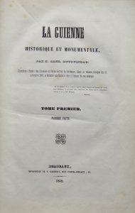 569.DUCOURNEAU (Alexandre). La Guienne Historique et Monumentale. Bordeaux, Coudert, 1842-1844.4 parties en 2 tomes in-4, reliure demi-basane fauve, dos lisse à décor romantique. Qq. épidermures, coiffe du t. 2 abîmée, mors fendu en tête du...