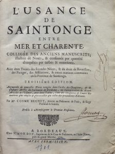 579.COSME BECHET. L’Usance de Saintonge entre Mer et Charente, colligée des anciens manuscrits, illustrée de Notes & confirmée par quantité d’enquêtes par turbes & notorietez… 3e édition augmentée de nouvelles Notes… Bordeaux, Simon...