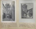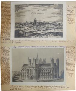 Écriture à l’encre violette, d’une même main.Très intéressant recueil - sans titre - illustré de clichés originaux marqués Clichés A. Chaine et de reproductions de documents abondamment légendés. La première partie (23 pp.) est composée de photographies (env . 17 x 11 cm) de monuments et documents directement liés à la ville, la seconde partie (19 pp. illustrées de 4 portraits par page) s’intéresse aux personnages de l’histoire qui sont liés de près ou de loin à la ville, de Robert II le Pieux à Claude Saudau. La dernière date apparaissant dans une légende est 1912 (qui est également la date du décès de Saudau).Érudit local, Adolphe Chaine (1860-1947), photographe et collectionneur, passionné d’histoire, était l’ami de l’archiviste Claude Saudau. Envisageant d’écrire une Histoire de Saint Jean d’Angély, il a laissé de nombreuses photographies et notes jamais publiées, léguées à la Société d’Archéologie qu’il a contribué à fonder. Le présent recueil pourrait être une ébauche d’un futur ouvrage. Cf. Dictionnaire Biographique des Charentais, p. 284.