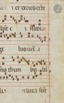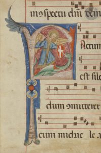 Dimensions : fragment (H. 263 x L. 180 mm) ; initiale (H. 210 x L. 90 mm). . Cette initiale est à replacer dans le contexte de l’enluminure émilienne du premier quart du XIVe siècle, sous l’influence d’artistes tels Neri da Rimini (actif entre 1300 et 1338). On rapprochera la présente initiale d’une initiale historiée figurant Saint Michel archange conservée à la Fondation Cini à Venise. On notera la proximité iconographique et stylistique entre les deux œuvres. Neri da Rimini, originaire de Rimini, est l’un des principaux protagonistes de la Renaissance naissante en Italie du début du Trecento. Il a apposé son nom « Opus neri miniatoris de arimino mccc » sur le bas de page du frontispice d’un autre antiphonaire datant de 1300 (Venise, Fondazione Giorgio Cini, Inv 2030).. Comparaisons : Fondazione Giorgio Cini, inv. 22232, initiale « F », Saint Michel archange, vers 1310-1312, attribué à Neri da Rimini. . . Texte : En latin, écriture gothique liturgique. Au recto : « Factum est…dum committeret…cum michie… » ; au verso : « […] et decies cente…Audi…[ang]elus iuxta…thuribulum… ». Musique notée carrée au dos sur des portées tracées à l’encre rouge. . . État : au verso, quelques traces d’encollage.. . Bibliographie : Massimo Medica e Federica Toniolo, Le miniature della Fondazione Giorgio Cini, Milano, SilvanaEditoriale, 2016, pp. 255-261 (n°76 à 80b) ; Jörn Günther. Catalogue 8. Fifty Manuscripts and Miniatures. Dr. Jörn Günther. Antiquariat. Hamburg, 2006, n°6.