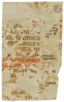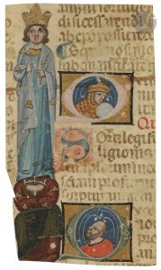 parchemin. Italie, Bologne, premier quart du XIVe siècle. Attribuable au Maître de 1328, « Second (ou Quatrième) Maître de San Domenico ». Dimensions : fragment (H. 90 x L. 51 mm) ; . initiales (H. 17 x L. 22 mm). . Ce fragment de feuillet offre deux initiales historiées sur fond d’or : l’une avec une figure de soldat dans une armure, l’autre avec une figure d’homme. L’entrecolonnement est illustré d’un homme couronné, vêtu d’une tunique et d’un manteau bleu rehaussés de motifs trilobés d’or, se tenant debout sur le dos d’un personnage recroquevillé, lui aussi couronné (couronne de prince ?) et vêtu d’une tunique couleur marron/bordeaux rehaussée des mêmes motifs trilobés d’or et d’un manteau vert. . . Bologne fut un centre important de production de manuscrits juridiques, avec le célèbre « Studio » ou université qui fit la réputation de la ville et les peintres étaient au contact d’influences de plusieurs nations qui affluaient dans la cité bolonaise. . Les visages des personnages avec leurs regards marqués par de grosses pupilles très noires, ainsi que le personnage couronné et recroquevillé sur lui-même dans sa tunique marron/bordeaux sont des caractéristiques types du style du Maître de 1328, que l’on retrouve dans un autre manuscrit au décor attribué à ce miniaturiste nommé « Quatrième Maître de Saint Dominique » par Venturino Alce in : La Basilica di San Domenico in Bologna, 1961 (Justinien, Digestum, Paris, BnF, latin 14341, fol. 15v). Les trilobes d’or que les personnages royaux portent sur leurs habits font également écho à ceux que l’on peut voir dans la figure du roi allongé du f. 283 du Digestum précité ou encore sur le tissu suspendu derrière la Madone trônant du manuscrit de la Matricola dei merciai (1328) (Bologna, Museo Civico, ms. 633).. . Texte : en latin, écriture ronde juridique. Extrait du Concilium Veneticum (Concile de Vannes) : « Sortilegi […] [re]ligionis […] sci[enti]am profitent[ur] […] scripturarum […] ». Voir Concilium Veneticum [CCSL, t. 148], Turnhout, Brepols, 2010. Il s’agirait d’une référence au canon 16 de ce concile qui se tint en 465, sous l’égide de saint Perpétue, premier archevêque de Tours. Ce canon impose l’excommunication aux membres du clergé qui se mêlent de divination. . . Comparaisons : Paris, Bibliothèque nationale de France, Latin 14341, Iustinianus, Digestum novum cum glossis Accursii, f. 15v, f. 283. La décoration de ce livre de droit est attribuable à l’artiste anonyme bolonais appelé par Alessandro Conti « Maître de 1328 » en référence à la peinture figurant en tête de la Matricola dei merciai de 1328 (Bologna, Museo Civico, ms. 633). Il fut grand producteur d’ouvrages juridiques, dont les Décrétales de Vienne (Österreichische Nationalbibliotek, cod. 2040), le Décret de Gratien de Madrid (Biblioteca Nacional, ms. Vitr. 21-2) et bien d’autres. . . État : au recto, encre pâle par endroits, écaillures de peinture ; or frotté par endroits. Au verso, trace de papier suite au collage entravant en partie la lecture du texte. . . Bibliographie : F. Avril, M.-T. Gousset et alia, Manuscrits enluminés d’origine italienne, t. 3, XIVe siècle – II. Émilie-Vénétie, Paris, 2013. pp. 53-57, notice 17 ; Milvia Bollati, Dizionario biografico dei miniatori italiani : secoli IX-XVI, Milan, 2004, pp. 473-474.