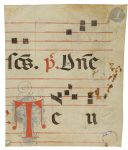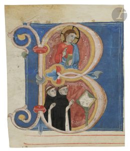 (H. 107 x L. 115 mm). . Initiale « B » historiée représentant le Christ bénissant (registre supérieur) et deux moines tonsurés de l’ordre bénédictin chantant la messe devant un antiphonaire posé sur un lutrin (registre inférieur). Pour donner du relief à sa composition, le miniaturiste choisit d’isoler ses personnages sur un fond rouge orné de végétaux avant de tracer une large bande de couleur jaune. Ce même registre stylistique est utilisé dans l’ensemble des initiales historiées de l’antiphonaire, tel que le montre le feuillet connexe conservé au Fitzwilliam Museum à Cambridge. . . Cette même iconographie sur deux registres, dans une initiale « B », est connue d’un atelier florentin (Maestro Geometrico / Maestro di Sant’ Alessio in Bigiano), pour un graduel conservé à Pistoia, Museo Diocesano, Sant’Alessio in Bigiano, 61, c. 306r. Les deux artistes avaient très certainement accès au même modèle. . . Texte : en latin, écriture gothique liturgique. Au verso, portées musicales de quatre lignes tracées à l’encre rouge et deux lignes de texte fragmentaire à l’encre noire et rouge : « […] s[an]c[tu]s psalmus d[omi]ne […] Teu[…] » ; grande initiale « T » peinte en rouge avec décor filigrané bleu.. . Feuillet connexe : Cambridge, Fitzwilliam Museum, ms. McClean 201.13c (représentant l’exécution de deux saints dans l’initiale « A »), ancienne collection Franck McClean (don en 1904). Au verso de ce feuillet, une partie de l’antienne des matines pour le Commun des martyrs, « Tamquam aurum in fornace… » . (118 x 110 mm).. . État : Au recto, peinture écaillée au niveau du décor ; au verso, quelques tâches.. . Bibliographie : N. Morgan, S. Panayotova, S. Reynolds, A Catalogue of Western Book Illumination in the Fitzwilliam Museum and the Cambridge Colleges. Part Two. Vols. 1-2 : Italy and the Iberian Peninsula, London, Harvey Miller Publishers, 2011, n°204, p. 14.