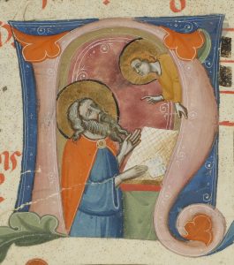 Dimensions : fragment (H. 80 x L. 70 mm) ; . initiale (H. 73 x L. 70 mm). . Cette initiale est extraite d’un graduel, ce que confirme au dos les éléments de texte avec un introït annoncé dans la rubrique tronquée. Malheureusement l’identification de la figure représentée reste difficile : un saint nimbé portant la barbe se présente devant un ange, avec un livre ouvert. Il doit s’agir de David psalmiste, que l’on représente parfois nimbé, sans couronne, devant Dieu ou un ange. La figure est peinte de profil, la tête basculée en arrière. . . Stylistiquement, cette initiale est des plus fines et se rattache à l’œuvre de Pacino di Bonaguida, actif à Florence de 1303 à 1347. Une initiale provenant d’un Psautier figure David psalmiste, nimbé comme dans le cas présent, confiant au Christ son âme figurée sous la forme d’un enfant également nimbé, est donnée comme l’œuvre de Pacino (Venise, Fondazione Cini, inv. 22082 ; voir Ulrico Agnati (a cura di), La Fondazione Giorgio Cini : cinquant’anni di storia, 2001). Elle présente des éléments stylistiques communs avec notre miniature qu’il conviendrait d’approfondir. De la même manière, on rapprochera la présente initiale de celles attribuées à Pacino di Bonaguida et conservées dans la collection Amati (Londres ; voir Offner/Boskovits, 1987, p. 564, pl. va-b) et dans l’ancienne collection Robert Lehmann (Palladino, 2003, n°20). Par ailleurs, le collaborateur puis principal continuateur du style de Pacino di Bonaguida est un artiste baptisé « Maître des effigies dominicaines » d’après un tableau figurant le Christ et la Vierge avec dix-sept saints dominicains (Archivio di Santa Maria Novella, Florence). Cet artiste est dit par Offner : « A miniaturist of considerable productivity, and radically dependent on Pacino » (Offner, 1987, p. 271). . . Texte : en latin, écriture gothique liturgique. Au verso, notation musicale carrée sur des portées de quatre lignes tracées en rouge. Rubrique (tronquée) : « In s[an]c[t]i io[…] Int[r]oit[u]s p[…] … [alle]luya … ». . État : bon mais pliure dans la partie inférieure de l’initiale ; au verso, encre légèrement effacée sans altération de texte.. . Bibliographie : Ulrico Agnati (a cura di), La Fondazione Giorgio Cini : cinquant’anni di storia, Milano, Electa, 2001, n°27, pp. 159-160 : « Pacino di Bonaguida. Frammento staccato da Salterio. David salmista e l’Eterno, secondo decennio del XIV secolo » ; sur Pacino di Bonaguida et son atelier, et sur le Maître des effigies dominicaines, voir les travaux de R. Offner et M. Boskovits, A Critical and Historical Corpus of Florentine Painting. The Fourteenth Century, Florence, 1987.