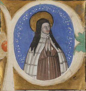 INITIALE « P » historiée. Sainte Claire d’Assise. Fragment extrait d’un antiphonaire ou d’un graduel ?. Tempera, gouache, encre et or bruni sur parchemin. Italie, Bologne, vers 1430-1440. Miniaturiste bolonais anonyme (dans le goût de...