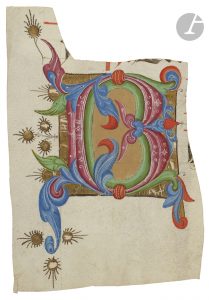 INITIALE « B » ornée. Fragment d’un antiphonaire ou graduel. Tempera, gouache, encre et or bruni sur parchemin. Italie, Florence (?), vers 1475. Dimensions : fragment (H. 175 x L. 127 mm) ; . initiale (H. 130 x 96 mm). . Texte : En latin,...