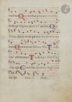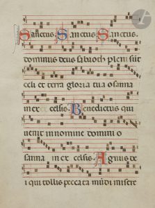 (recto), chant d’acclamation et de louange à la gloire de Dieu (Te Deum). Il est récité ou chanté pendant la messe, entre la préface et la prière eucharistique, mais aussi une partie du Gloria (verso). . . Texte : En latin. Ecriture gothique liturgique. Notation musicale carrée sur des portées de quatre lignes tracées en rouge ; initiales peintes en rouge ou bleu avec décor filigrané rouge ou bleu. Au recto, « Sanctus. Sanctus. Sanctus. Dominus Deus sabaoth pleni su[n]t c[a]eli et terra gloria tua osanna in excelsis. Benedictus qui venit in nomine domini osanna in excelsis. Agnus dei, qui tollis peccata mundi misere » ; au verso « […] nobis. Qui tollis peccata mundi suscipe deprecationem nostram. Qui sedes ad dextera[m] patris miserere nobis. Quonia[m] tu solus s[an]c[tu]s. Tu solus dominus. Tu solus altissim[us] [Ihesu] [Christe]. Cum s[an]c[t]o spiritu in gloria dei patris. Amen ».. . État : plusieurs trous au parchemin portant parfois atteinte au texte, pliures. Bon état général. Analyses anciennes au verso.