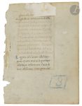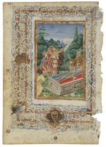 son atelier. Dimensions : feuillet (H. 142 x L. 102 mm) ; . miniature : (55 x 80 mm). . Ce feuillet illustrait un livre d’heures, introduisant l’Office des morts. Le manuscrit a certainement été réalisé pour une congrégation religieuse : on reconnait un moine témoin de la scène des trois morts et des trois vifs, vêtu de gris. Dans la bordure, un oiseau et un lapin, et dans la bordure inférieure un médaillon quadrilobé dans lequel s’inscrit un crâne, comme on trouve souvent dans les livres d’heures italiens pour illustrer l’Office des morts.. . L’artiste de ce feuillet est à rapprocher des manuscrits peints par Mariano del Buono di Jacopo (1433-1504) avec un décor de bordure qui semble influencé par Ricciardo di Nanni. Mariano del Buono a d’ailleurs collaboré avec Ricciardo di Nanni dans un manuscrit contenant les œuvres de Livio (Munich, Bayerische Staatsbibliothek, Lat., 15731-15733). La bordure associant double filets dorés, bianchi girari et éléments de bestiaire est réalisée par la même main qui peint le petit livre d’heures conservé à Londres, Victoria and Albert Museum (Reid 63 / MSL/1902/1706). . On soulignera aussi le traitement semblable des arbres et une palette commune. . . Texte : En latin. Ecriture humaniste italienne. Texte au verso, à l’encre brune et rubrique en rouge pâle : « […] Gloria tibi dom…Magnificat anima mea deum. Notandum quod prima antifana [sic] de laudibus dicitur ad primam. Secunda ad tertias. Tertia ad sestam. Quinta ad nonam … ».. . Comparaisons : Londres, Victoria & Albert Museum, Book of Hours, Use of Rome, in Latin, c. 1480, Italy (Tuscany or Umbria). Voir R. Watson, Victoria and Albert Museum. Western Illuminated Manuscripts, vol. I, Londres, 2011, cat. n°117, pp. 624-627 : « Despite textual indications, it seems safe to attribute this MS to Florence. Garzelli attributed the miniatures to « an energetic master working next to the young Mariano del Buono [di Jacopo] with whom he had so much in common as to make us suspect that we are dealing with Mariano himself » (Garzelli, I, p. 212), while Diego Galizzi attributes the illumination to the « workshop » of Mariano (Galizzi, DBMI, p. 729) ».. . État : Au recto réglure à la pointe sèche visible ; feuillet rogné un peu court en hauteur, un côté du feuillet avec déchirures ; marge de droite avec petits manques de parchemin ; au verso restes de papier de fixation ; chiffre « 3 » au crayon bleu. . . Bibliographie : Garzelli, A., « Le immagini, gli autori, i destinatari », in La miniatura fiorentina del Rinascimento, 1440-1525: un primo censimento ed. Annarosa Garzelli (Inventari e cataloghi toscani, 18-19: 2 vols., Florence, 1985), . pp. 190-215. – Levi d’Ancona, Miniatura e miniatori a Firenze, pp. 175-181. – Galizzi, D., « Mariano del Buono », in Dizionario biografico dei miniatori italiani, secoli IX-XVI, ed. M. Bollati, Milan, 2004 [DBMI], p. 729.