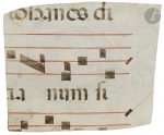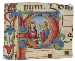 Francesco puis Girolamo Dai Libri ?). Dimensions : fragment (H. 123 x 144 mm) ; . initiale (H. 104 x 85 mm). . Sur fond d’or, l’initiale « P » extraite d’un antiphonaire ou d’un graduel, flamboie par ses couleurs chatoyantes. La scène historiée représente deux figures de saintes avec pour attributs une épée et la palme du martyre – peut-être sainte Libérate et sainte Faustine. Afin d’échapper au mariage que leur imposaient leurs parents, Libérate et Faustine se réfugièrent auprès du moine Marcellus qui les conduisit au-delà du Pô, au couvent Sainte-Marguerite à Côme. Ces deux saintes étaient vénérées à Côme, en Lombardie, le 18 janvier ainsi que dans le nord de l’Italie. . . La palette vive et le style des figures rappellent les œuvres peintes à Vérone dans les dernières décennies du Cinquecento jusque dans la première moitié du XVIe siècle, notamment les œuvres de Francesco (c ; 1450-1503/1506) puis Girolamo (1474-1555) Dai Libri, père et fils enlumineurs. L’artiste de la présente initiale est familier du langage ornemental et figuratif de l’atelier Dai Libri de Vérone. Sur cet atelier, voir Mantegna e le arti a Verona 1450-1500, éd. S. Marinelli et P. Marini, exposition 2006-2007.. . Texte : en latin, écriture gothique liturgique. Musique notée carrée sur des portées à quatre lignes tracées à l’encre rouge. Au recto, « num Dom[ine] […] Pe[…] » ; au verso, « iohanes di […] tia num si […] ».. . État : quelques manques à l’or bruni sans gravité.