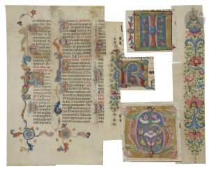 saint Mathieu apôtre et évangéliste, avec rubrique tronquée : « […] s[an]cti mathei apo[stoli] [e]vangeliste. I[ntroitus] […] » ; messe pour saint Nicomède martyr avec rubrique : « […] in[sin]t nicomedis m[a]r[t]is introitus […] ». Initiales historiées : « E » avec saint Mathieu apôtre et évangéliste et « L » avec saint Nicomède martyr. Dimensions : H. 350 x L. 102 mm ; H. 347 x L. 110 mm . . 3. Initiale « I », Italie, Venise, vers 1460 (?), extraite d’un antiphonaire ou graduel. Dimensions : H. 93 x L. 110 mm . . 4. Initiale « R », Italie, Ferrare, vers 1460-1470 (?), extraite d’un antiphonaire ou graduel. . Dimensions : fragment (H. 260 x L. 110 mm), initiale (H. 60 x L. 70 mm). . 5. Initiale « G », Italie, Venise (?), vers 1525-1550, extraite d’un antiphonaire ou graduel. Dimensions : H. 128 x L. 127 mm. . 6. Bordure enluminée découpée, Ferrare (?). Dimensions : H. 345 x L. 67 mm. . État : Six fragments contrecollés sur du carton et placés sous verre. Premier fragment avec portion de la largeur de la colonne découpée (restauration ancienne). Les initiales historiées ne sont pas affectées par le découpage.