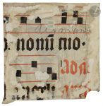 Dimensions : H. 100 x L. 100 mm. . Sur un fond beige avec un décor en damier orné de petites croix rouges, une initiale « A » historiée apparaît sur un fond bleu outremer parsemé d’un décor géométrique de croisillons blancs et de ronds rouges. Le Christ, au nimbe cruciforme, se tient debout à la porte de ce qui semble être la Jérusalem Céleste. Il y accueille l’ensemble des apôtres, dont Pierre et Paul au premier rang. L’Apocalypse selon saint Jean dit des remparts de la Jérusalem céleste qu’ils « reposent sur douze assises portant chacune le nom de l’un des douze Apôtres » (21 :14) et c’est une ville symbolique qui représente le groupe des disciples de Jésus appelés à régner au ciel avec lui dans le royaume de Dieu (Révélations 3 :12 ; 21 :2). L’architecture se détache de l’initiale même pour occuper l’espace entier du décor. . . L’exécution parfaite de l’architecture de la Jérusalem céleste, le traitement des coloris, et la minutie apportée dans le traitement des figures malgré une uniformité dans leurs traits (yeux en amande avec des pupilles très noires sur les côtés, chevelure longue et ondulée, orteils et doigts longs et sinueux, silhouettes longilignes) placent cette miniature sur le même plan artistique, qualitativement et stylistiquement, que des manuscrits réalisés à Metz pour son évêque Renaud de Bar (entre 1303 et 1316), grand mécène. Plusieurs mains ont été identifiées dans ces manuscrits, et nul doute que l’artiste qui a peint cette miniature a travaillé auprès des plus grands. D’autre part, l’enracinement d’une tradition d’illustration du texte apocalyptique est encore attesté en Lorraine au début du XIVe siècle par les deux Apocalypses en français conservées à Dresde (OC 50) et à Liège (MsW5).. . Malheureusement, durant la Seconde guerre mondiale, 1 450 manuscrits furent transférés de la bibliothèque de Metz au Fort du Mont-Saint-Quentin et dont la moitié disparaîtra lors de l’incendie qui ravagea le fort en septembre 1944. La miniature serait-elle extraite d’un de ces manuscrits disparus ?. . Texte : en latin, écriture gothique liturgique. Au verso, notation musicale carrée sur des portées de quatre lignes tracées en rouge, « [a]d nomini tuo […] celi […]. Rubrique ad n[onas] ». . . Comparaisons : Bréviaire à l’usage de Verdun, Verdun, Bibl. mun., ms. 0107, f. 090v, f. 092 ; Londres, Sotheby’s, Western Manuscripts and Miniatures, December 1 1998, lot. 12. Des rapprochements stylistiques sont également à faire avec les personnages de la Chronique dite de Baudouin d’Avesnes (Arras, BM, MS 863, f. 7, f. 9, f. 19v, etc.), probablement de la région de Thérouanne (nord de la France) datant de la fin du XIIIe siècle. Ainsi, en dépit de son anonymat, le maître de cette miniature appartient à un noyau d’influences provenant d’ailleurs, qui témoigne du mouvement des artistes vers la Lorraine à la faveur du mécénat entourant Renaud de Bar.. . État : excellent. Au recto, décor de la haste montante tronquée. Au verso, restes de papier dû à un encollage ancien.. . Bibliographie : Kay Davenport, The Bar Books : Manuscripts Illuminated for Renaud de Bar, Bishop of Metz (1303-1316), Turnhout, Brepols, 2017 ; Alison Stones, Les manuscrits de Renaud de Bar, colloque « L’écrit et le livre peint en Lorraine, de Saint-Mihiel à Verdun (IXe–XVe siècles) », Turnhout, Brepols, 2014, pp. 11-27.