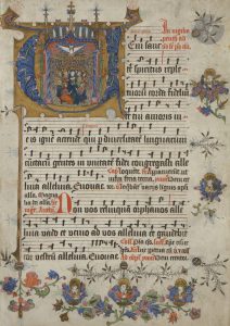 173 mm). . Ce feuillet est extrait d’un graduel qui a certes été monumental avant son démembrement : il offre la musique et le chant pour la messe de Pentecôte, avec des prières en l’honneur du Saint-Esprit. Le texte donne des indications liturgiques et rituelles, telle « fleximus genua » (nous nous mettons à genoux). Le corps de l’enluminure nous semble peinte par une main différente de celle responsable des marges enluminées, qui peint un décor dans lequel s’inscrivent des personnages féminins couronnés. On reconnait dans le bas-de-page trois figures qui doivent être les trois Marie portant des offrandes. Il s’agit peut-être d’une commande pour une fondation de religieuses. . De plus amples recherches permettront certainement de rattacher ce feuillet – véritable redécouverte – à un atelier et/ou fondation pieuse connue. . . Texte : En latin. écriture gothique liturgique germanique (littera textualis formata). Notation musicale carrée en sabot à cheval « hufgnagelschrift ». Au recto : « Veni sancte spiritus repletuorum corda fidelium et tui amoris… » ; au verso, certainement lisible mais parchemin collé pour l’heure en plusieurs points empêchant la lecture du verso.. . État : bon état général. Au recto, tâches, quelques bavures d’encre.