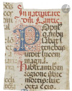 gothique liturgique ; au recto, cantique pour la Nativité : « In nativitate domini. Cantic[um]. Populus quod ambulabat in tenebris vidit lucem magnam. Habitantibus in regione umbre mortis lux orta es eis… ».. . État : Encre frottée et corrosive, une partie du texte sans doute remaniée.