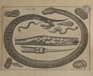 Laurent d’Houry, 1694. — In-8, 188 x 115 : frontispice, (5 ff.), 367 pp., (12 ff.), 3 planches. Veau brun, dos à nerfs orné, tranches rouges (reliure de l’époque).. . Seconde édition revue et augmentée de ce traité composé par Moïse Charas (1618-1698).. Ce dernier avait été successivement démonstrateur de chimie au Jardin du roi, chimiste de Charles II d’Angleterre, et médecin en Hollande puis en Espagne où il fut arrêté par l’Inquisition. Revenu en France il fut reçu à l’Académie des Sciences en qualité de chimiste.. Dans cet ouvrage, paru pour la première fois en 1669, il propose une étude sur l’anatomie de la vipère ainsi que sur la source et les effets du venin. Il y soumet les expériences réalisées publiquement au jardin du roi et défend la thèse que la vipère est un antidote à sa morsure, thèse opposée à celle d’un autre spécialiste du sujet le biologiste italien Francesco Redi (1626-1697) avec lequel il entretint une longue controverse. On trouve in fine des vers en latin de l’auteur. . L’édition est illustrée d’un frontispice et de 3 planches dépliantes.. Frottements d’usage à la reliure. Planches brunies.. Provenance : Jacques Mothereau, chirurgien parisien, avec ex-libris.